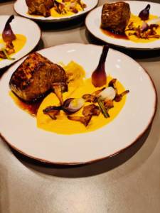 - Filet de veau et son jus de viande, mousseline de carottes, courgettes spaghetti et ses girolles