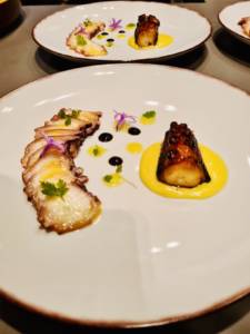 - Poulpe snacké et son carpaccio, béchamel de poivrons jaunes