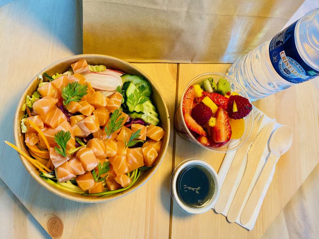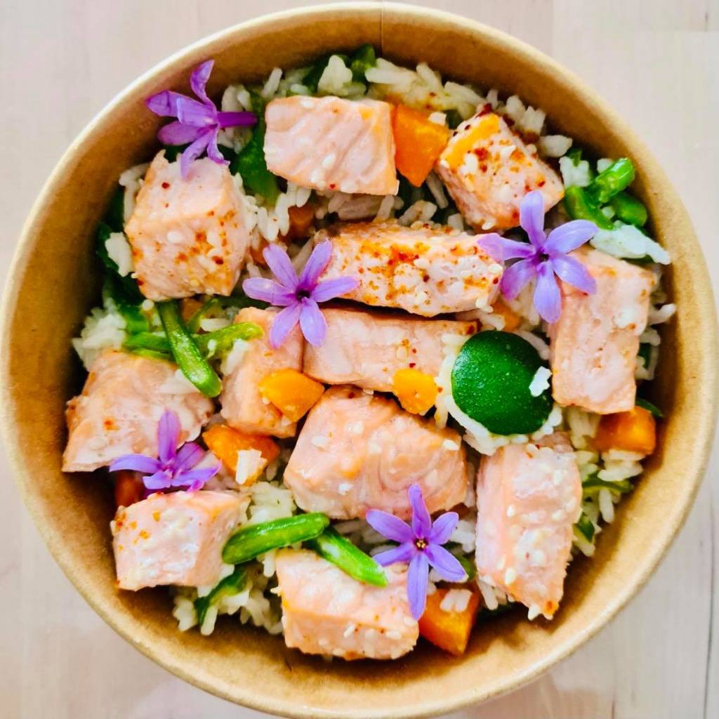 - Saumon, poulet ou végétarien accompagné de quinoa mariné thaï, avocat, légumes croquants, salade et herbes fraîches