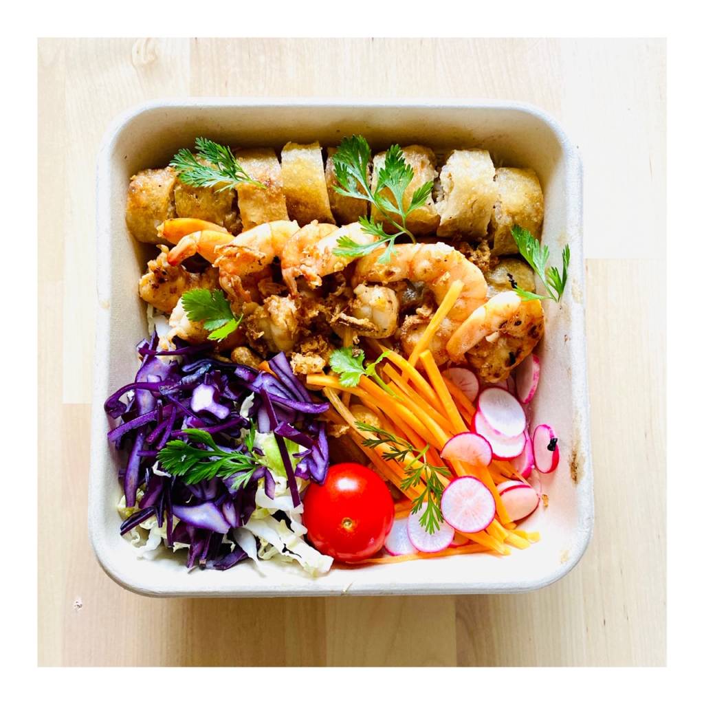 - Poulet au curry ou crevettes accompagné de vermicelles, nems de poulet, légumes de saison, cacahuètes, oignons frit, herbes fraîches