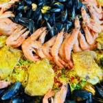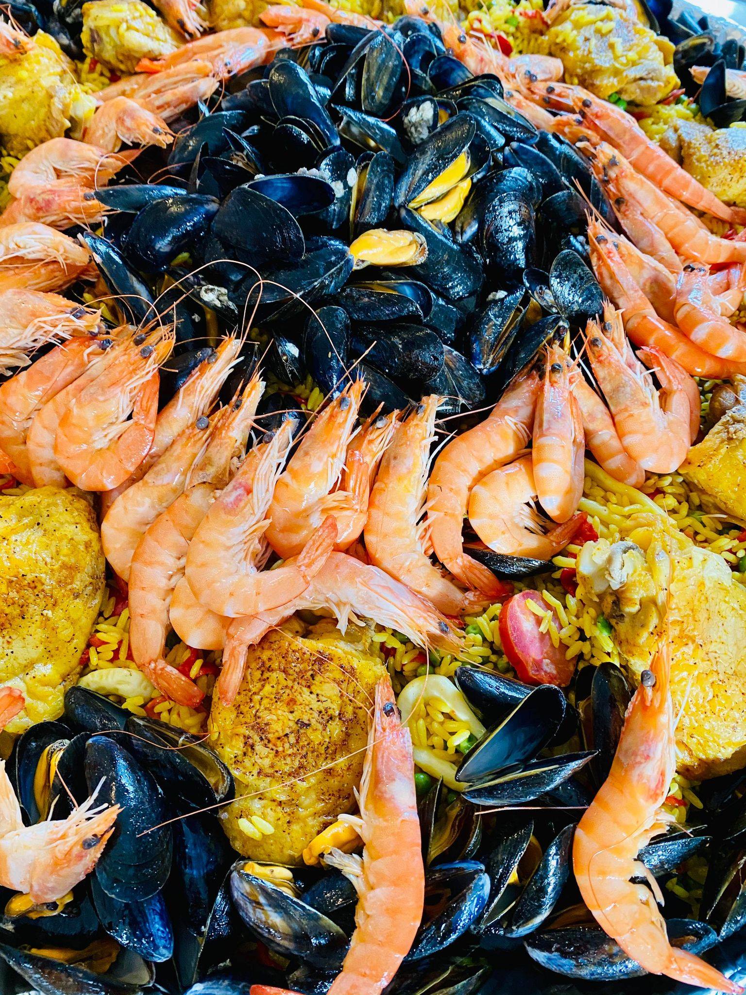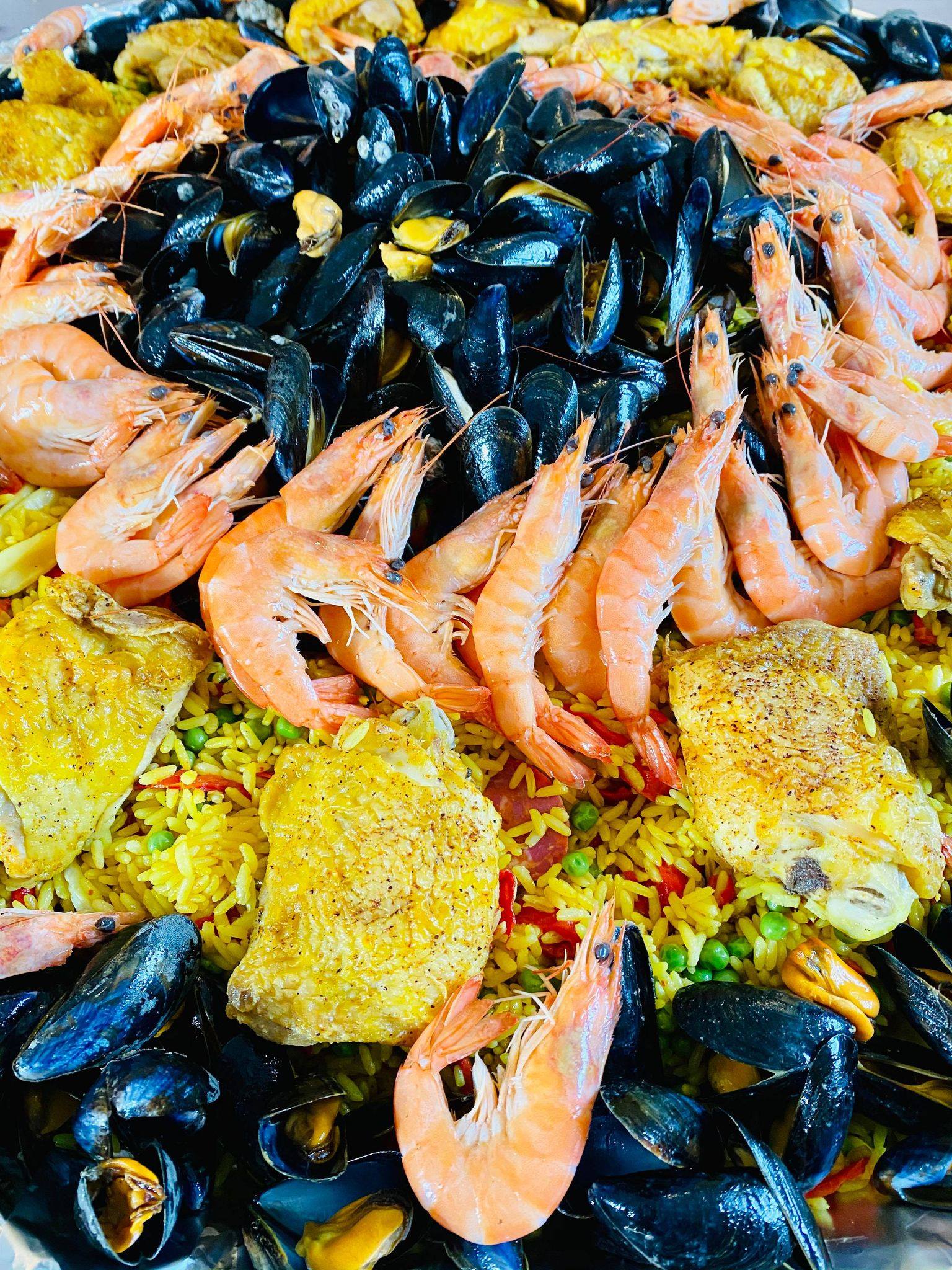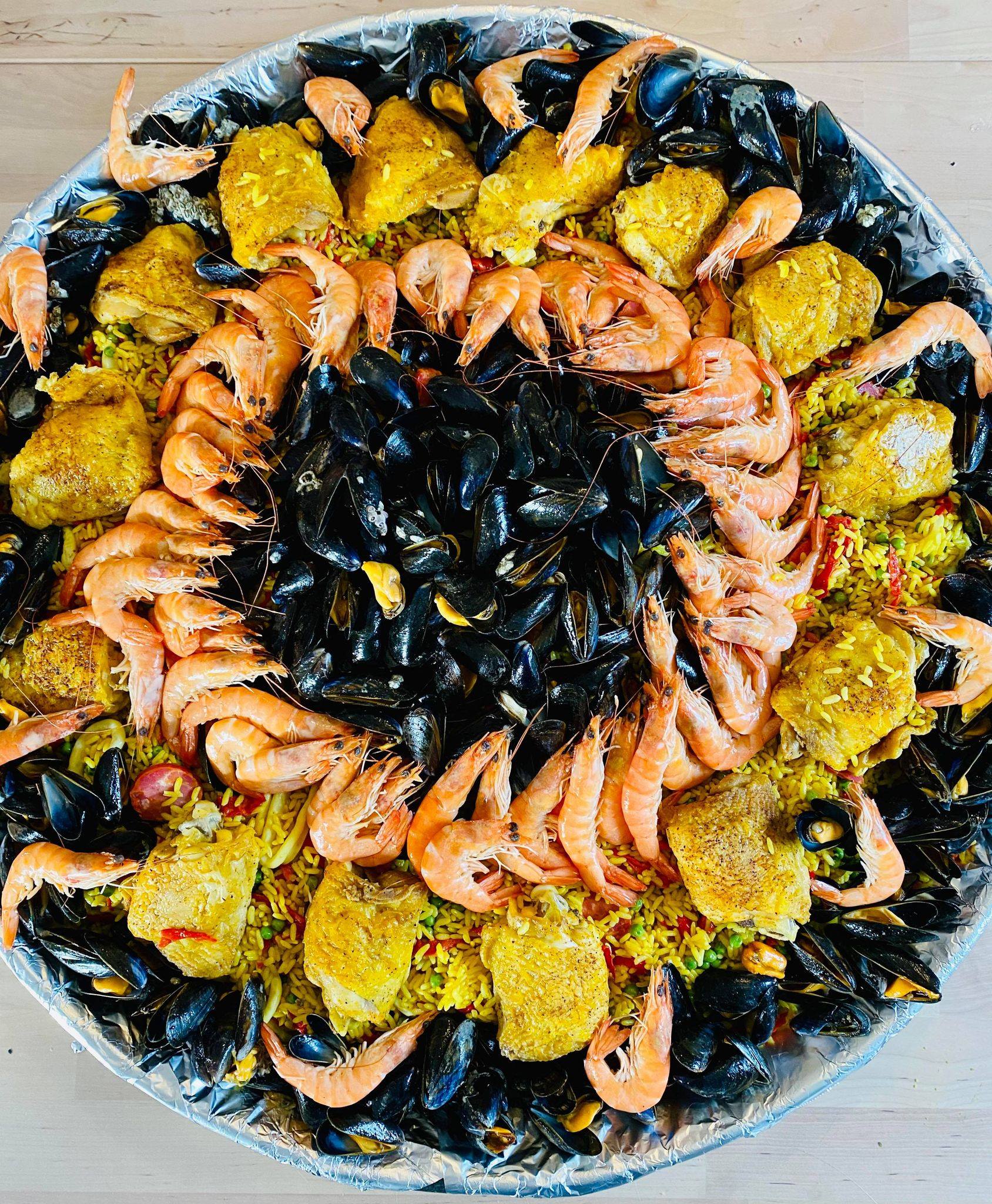 Paëlla composé de riz safrané, poulet, chorizo, fruits de mer.